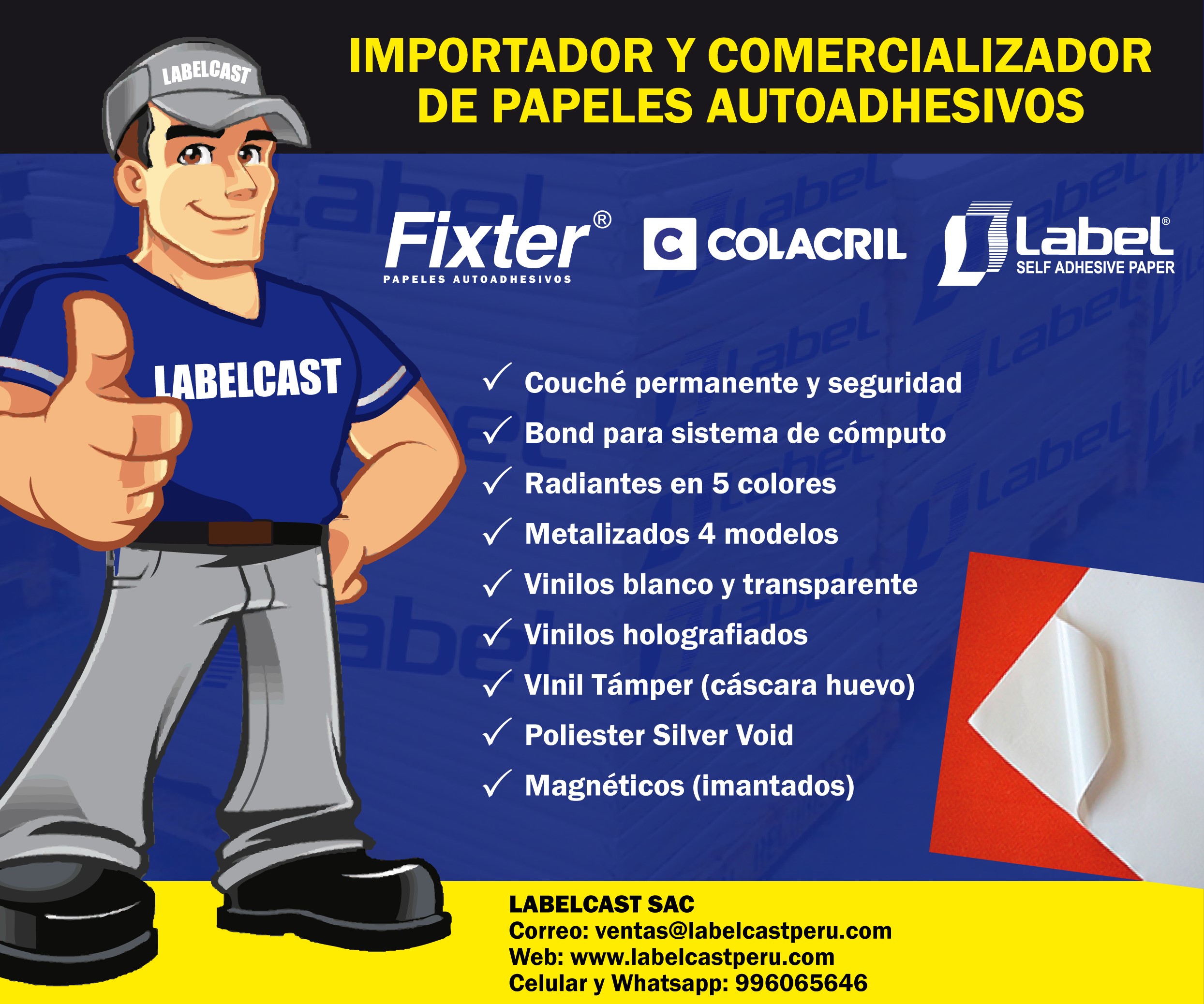 Somos una empresa especializada en la importación y comercialización de toda la gama de PAPELES AUTOADHESIVOS, para la Industria gráfica, con 30 años de experiencia en el rubro; logrando posesionarnos a nivel nacional, con las marcas LABEL, importado de China, FIXTER, importado de Italia, COLACRIL, importado de Brasil.
